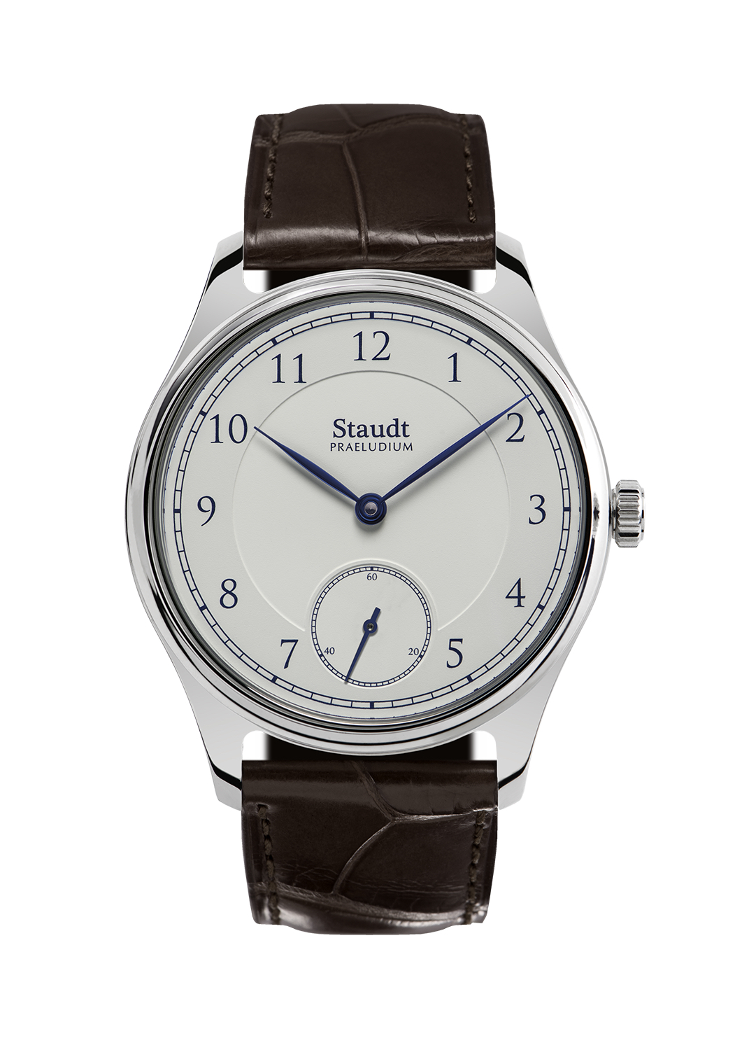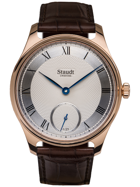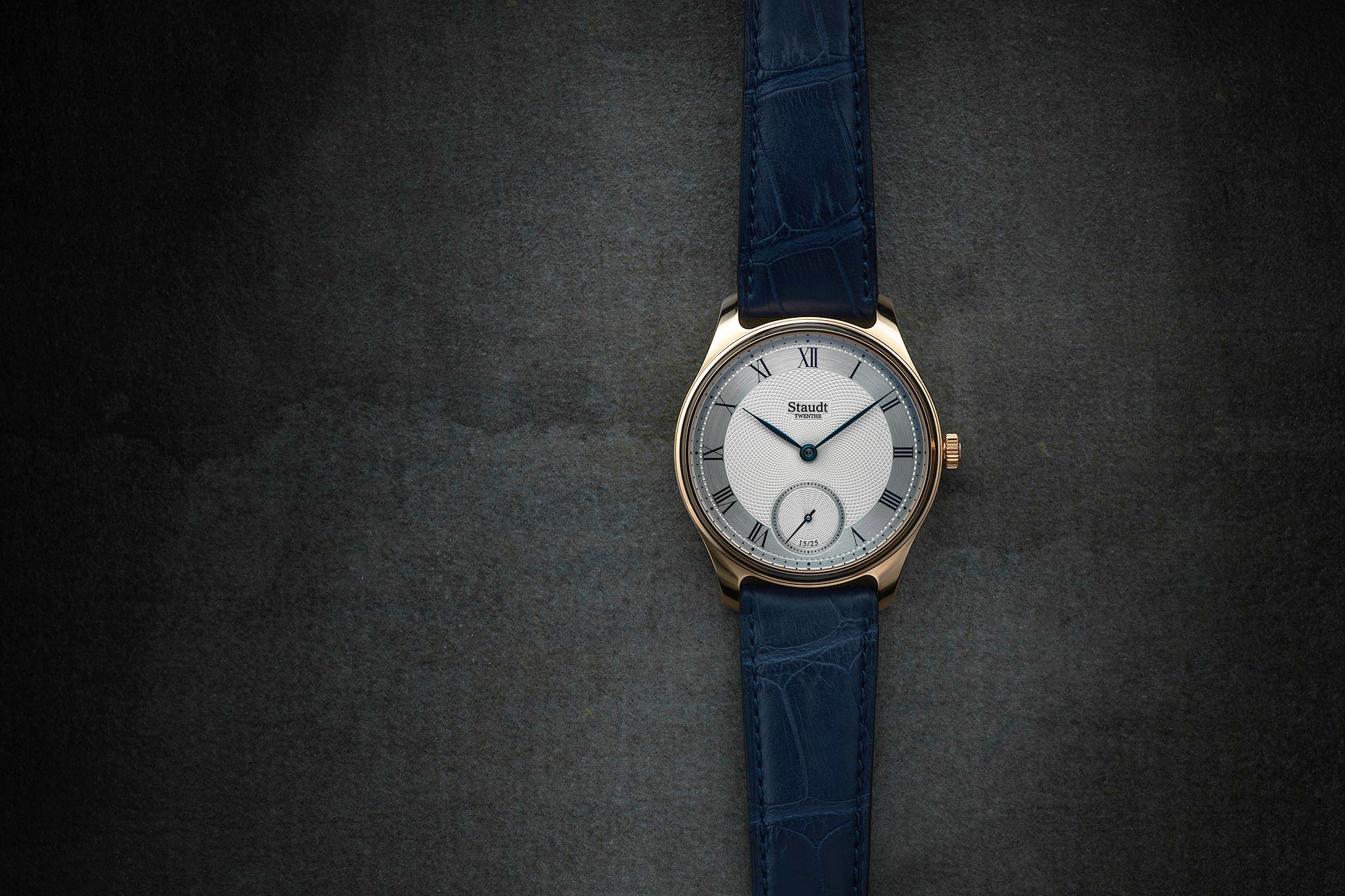Heute bietet Staudt Watches eine ganze Kollektion an, darunter auch das auf 25 Stück limitierte Meisterwerk Praeludium Guilloche mit einem Gehäuse aus 18 Karat Roségold und einem von Hand guillochierten Zifferblatt, das optisch aus der Reihe tanzt.